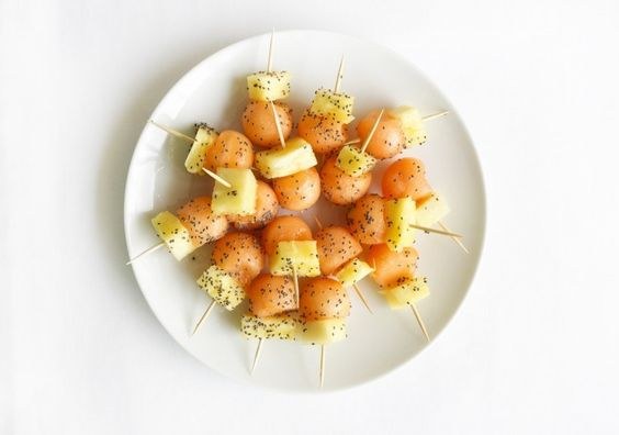 En esta receta solamente tenemos que montar las brochetas. Para ello, te recomendamos que te lleves al trabajo dos tuppers con los trocitos de fruta elegidos. Alternando las dos frutas vamos a insertarlas en el palillo y, por último, espolvoreamos por encima las semillas de chía que le darán una textura genial.