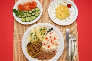 - Camarones, ensalada de habichuelas, ensalada de mango, papaya y piña.